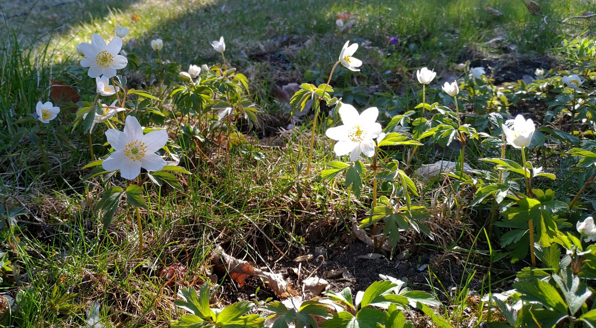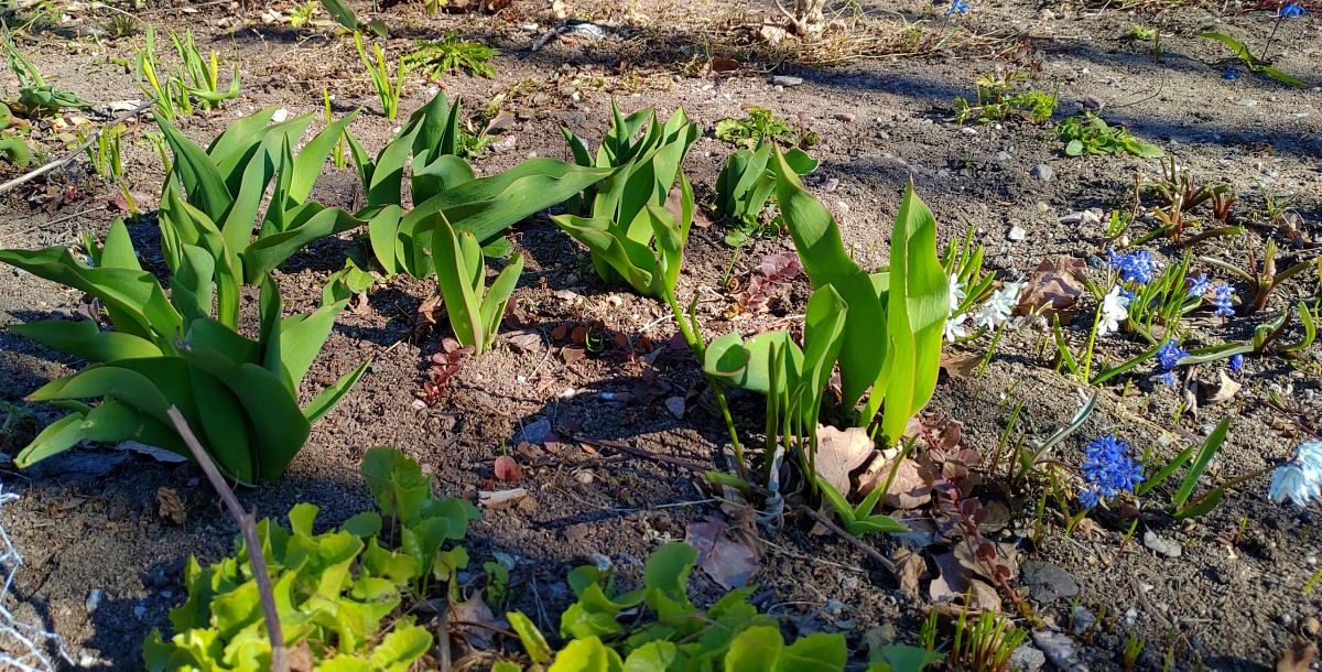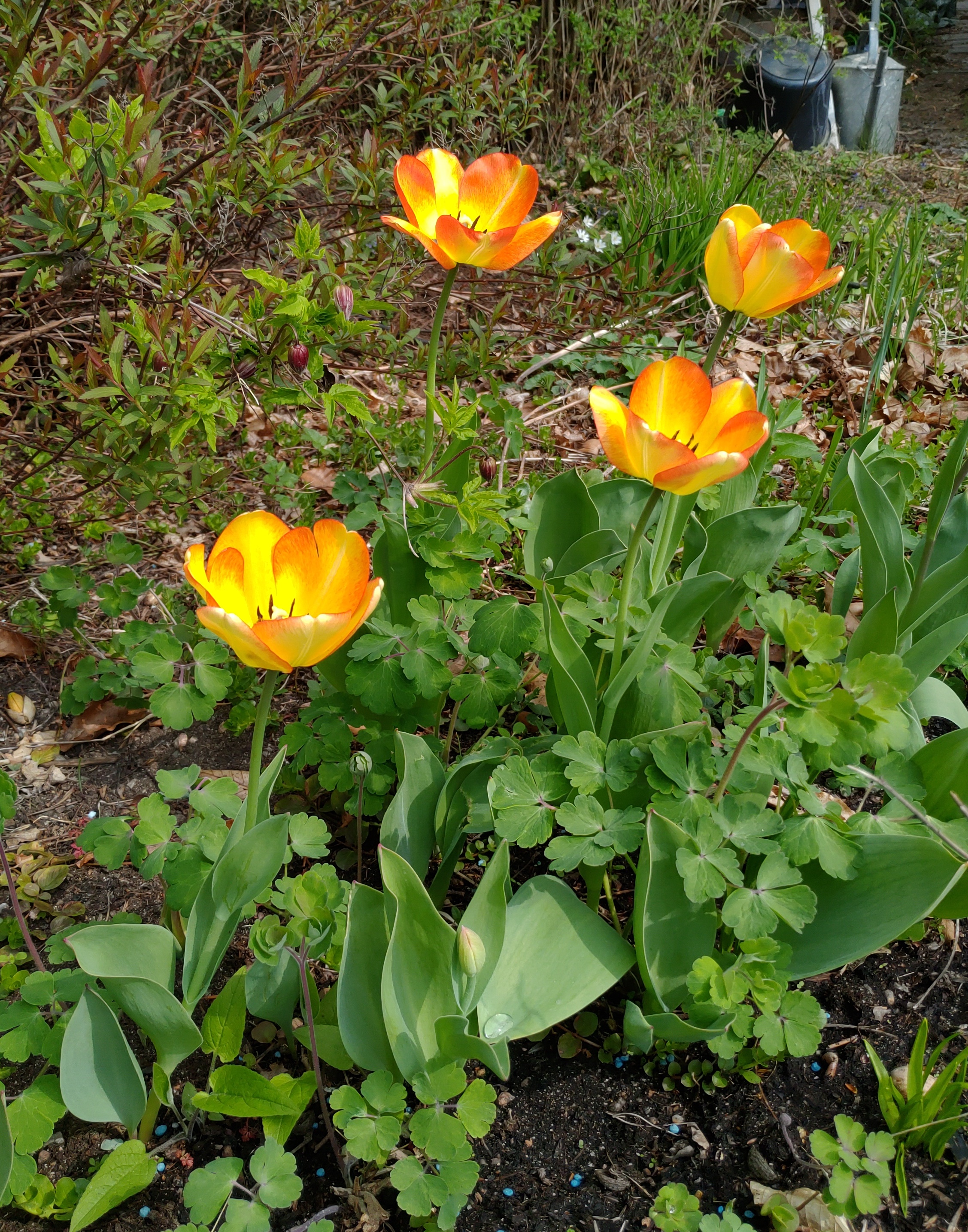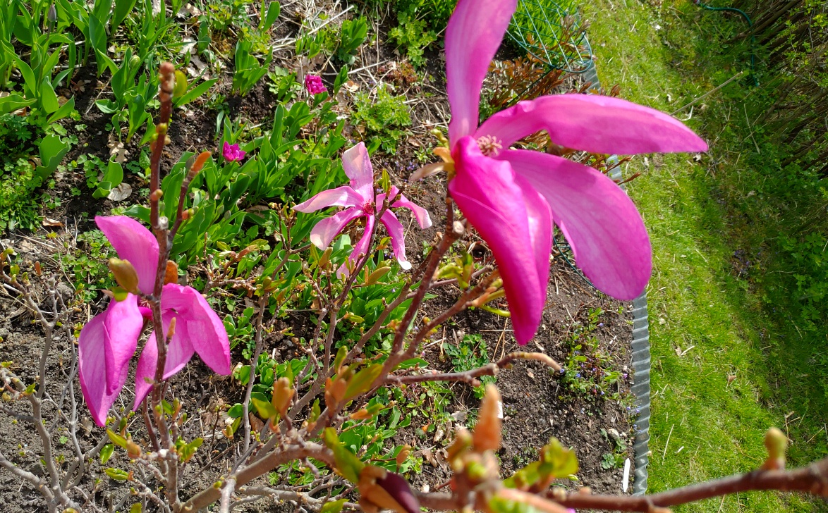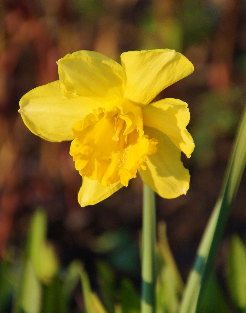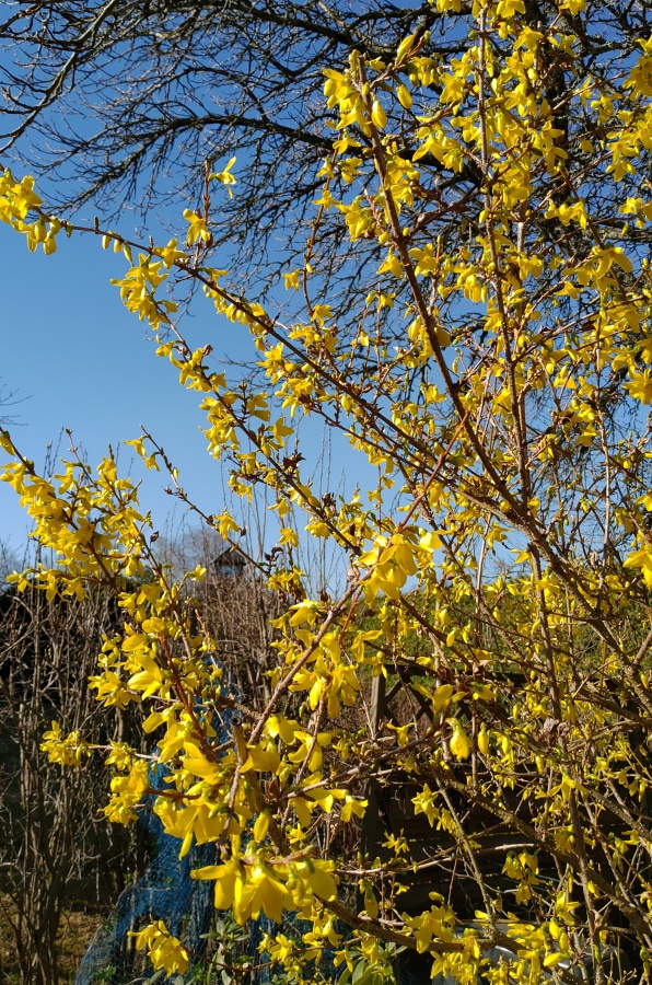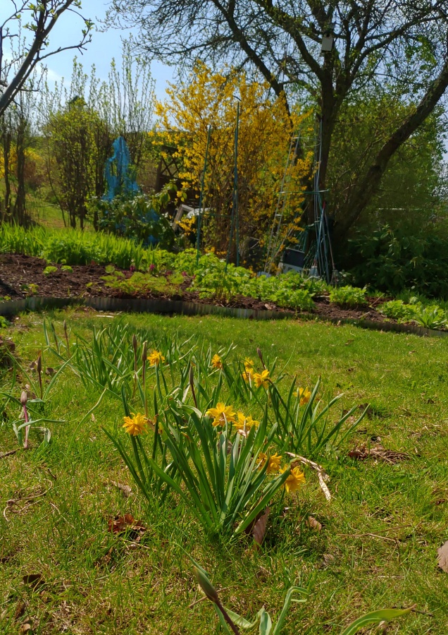 Forstyhia i bakgrunden, Narcisser i gräsmattan