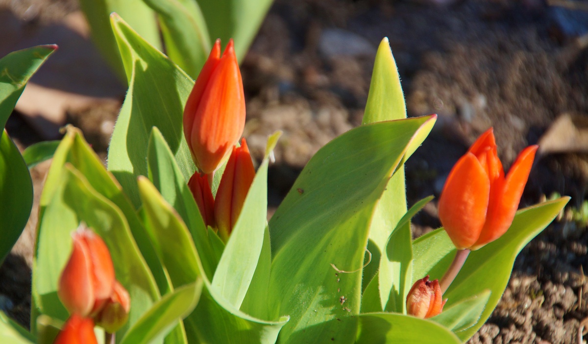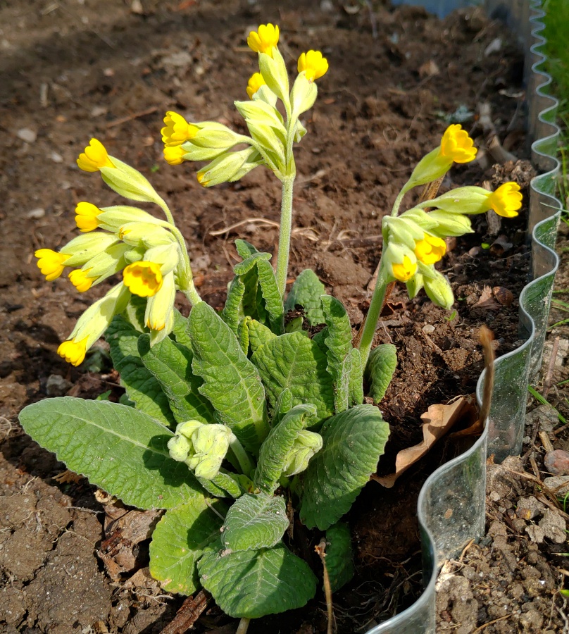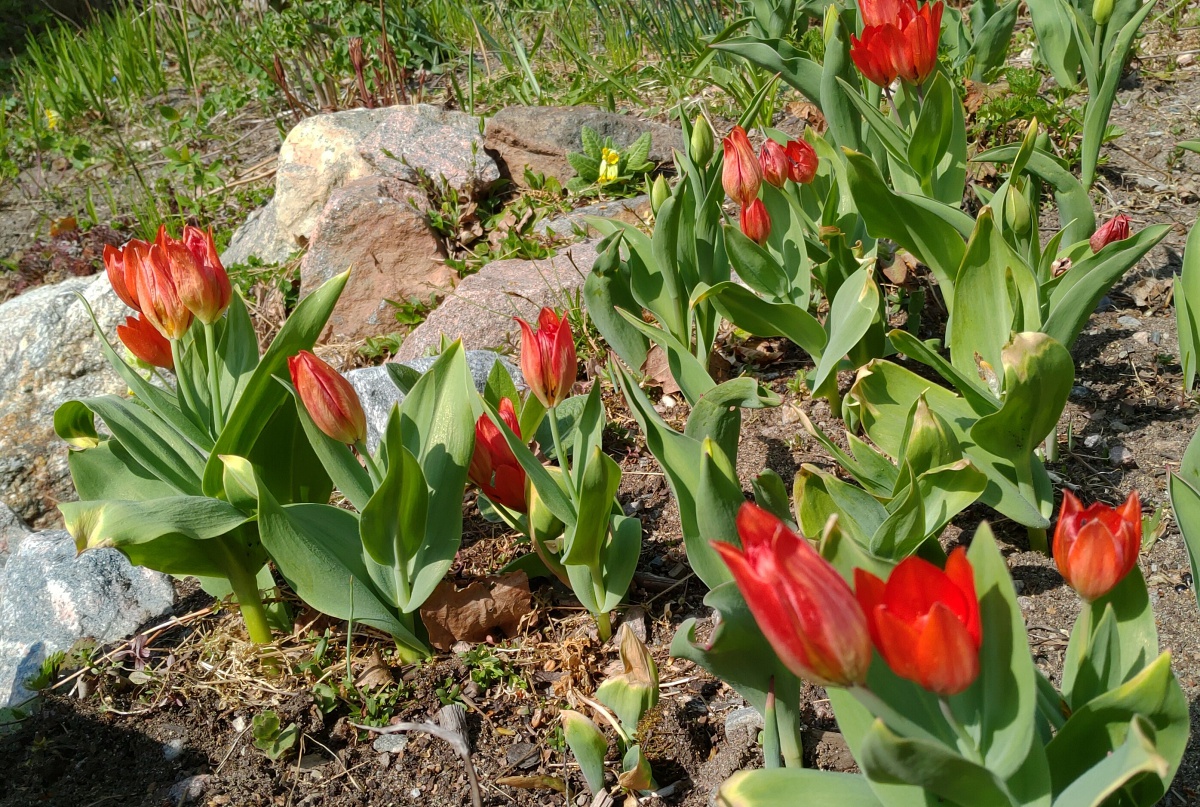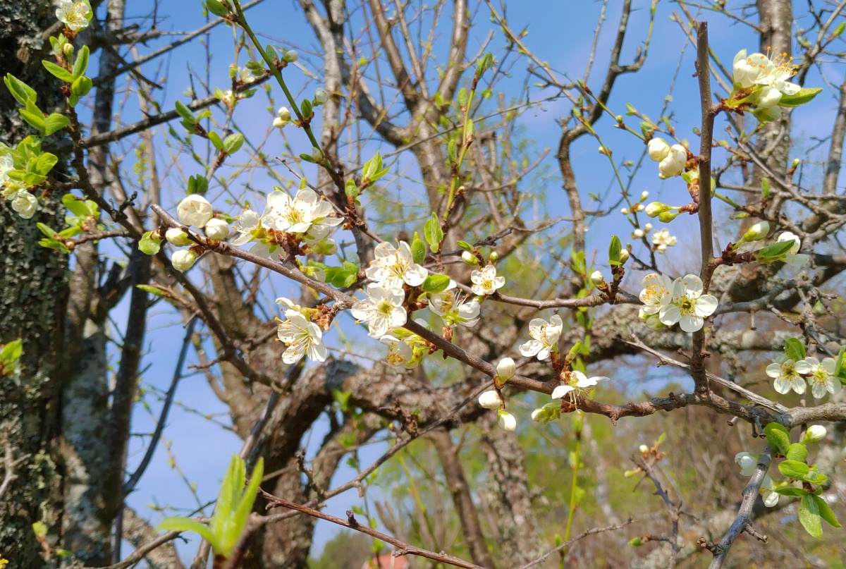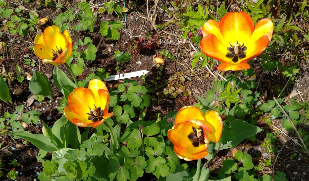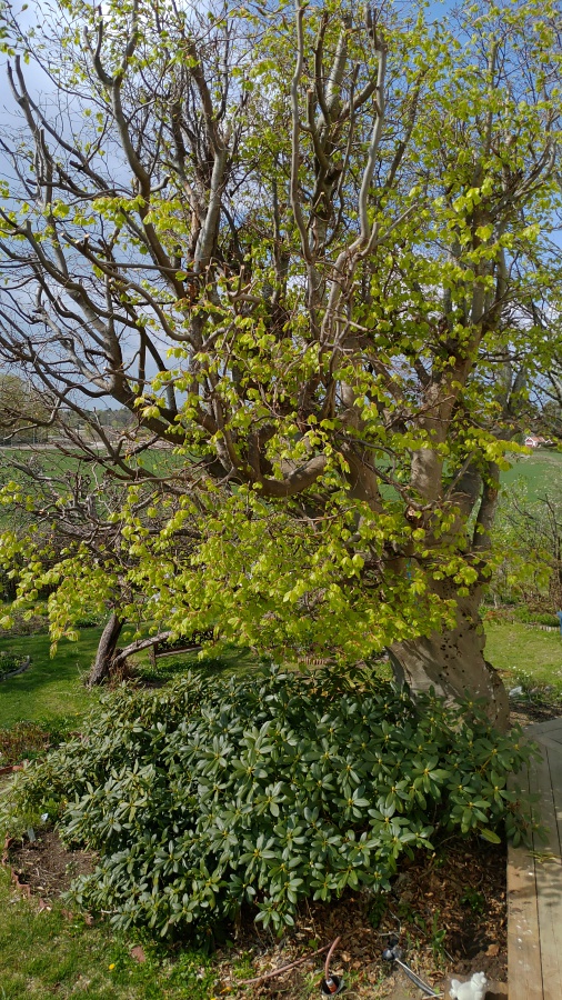 Forstyhia i bakgrunden, Narcisser i gräsmattan