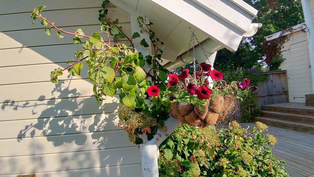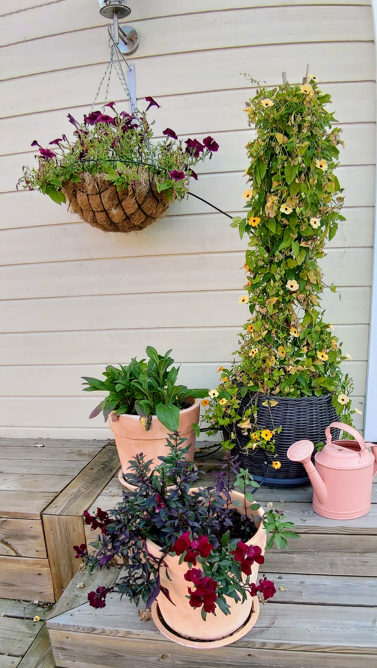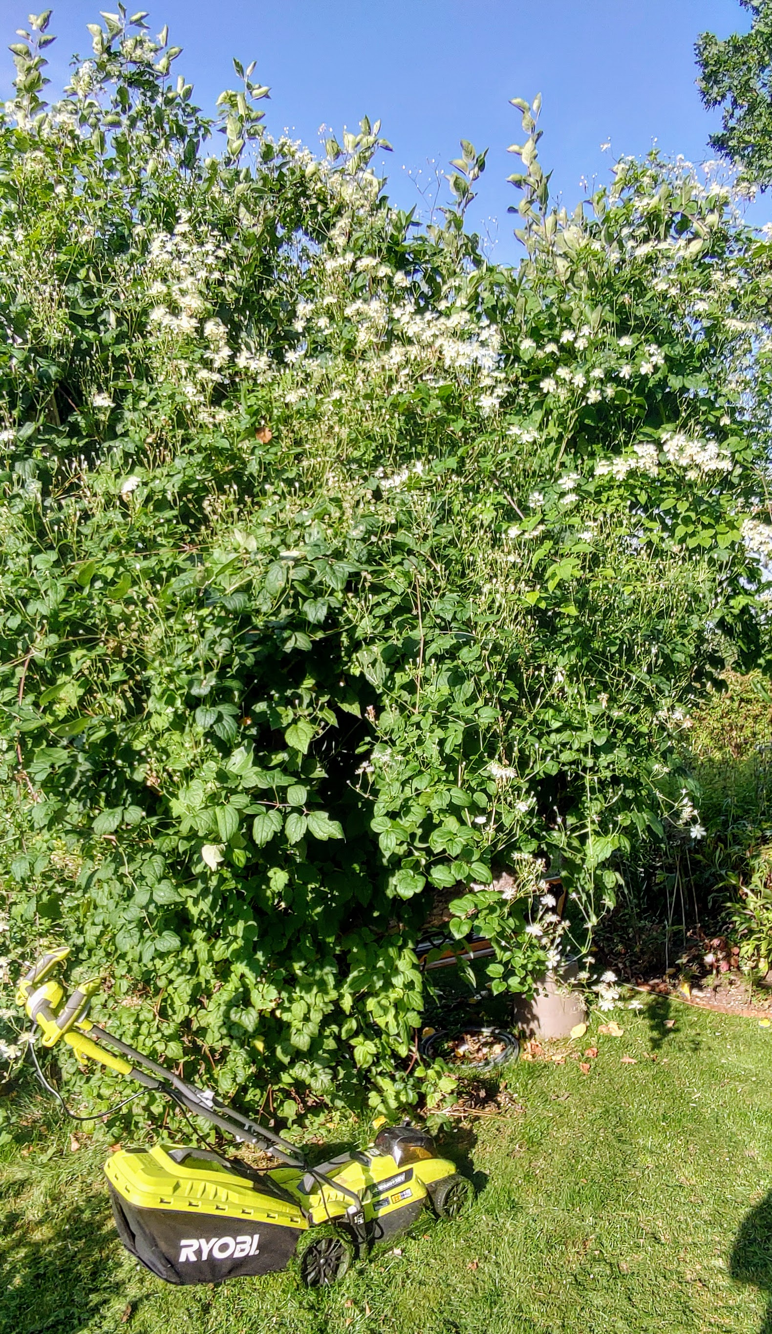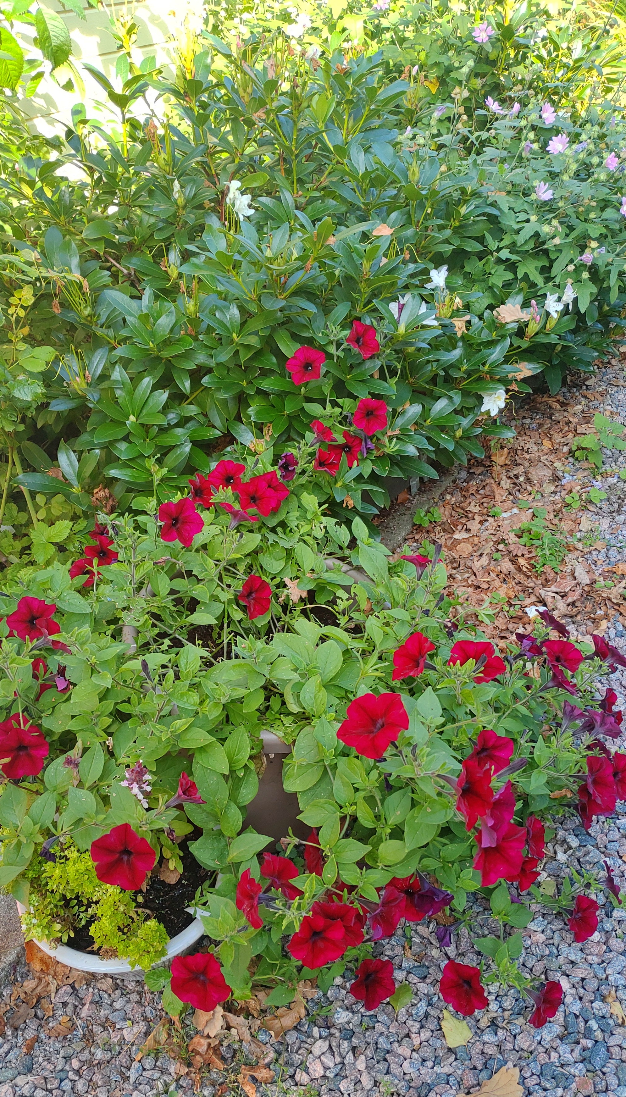 Vi var borta i 3 veckor men krukor och trädgård klarade sig bra. Men tungt gräsklippningsjobb. 4 batterier och gubbe tog slut.