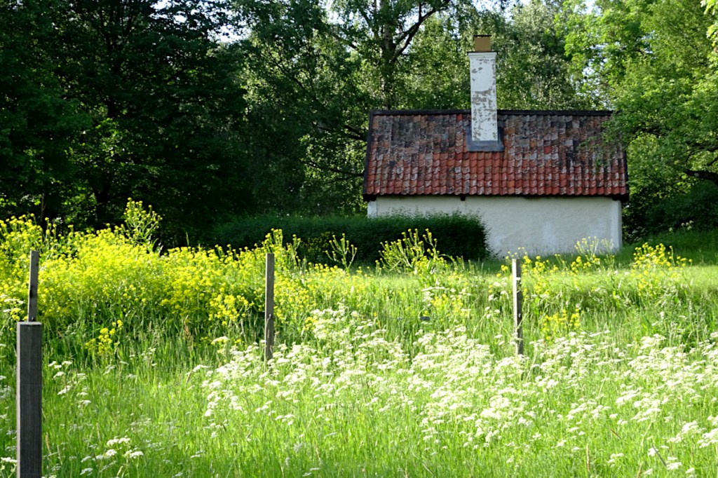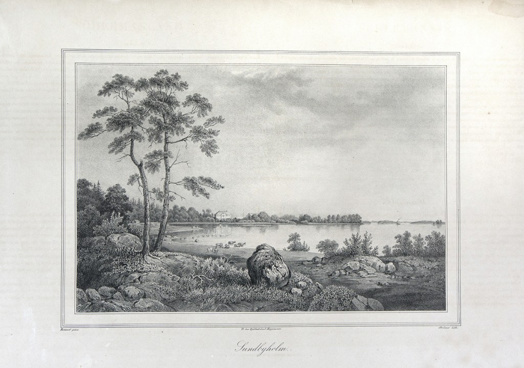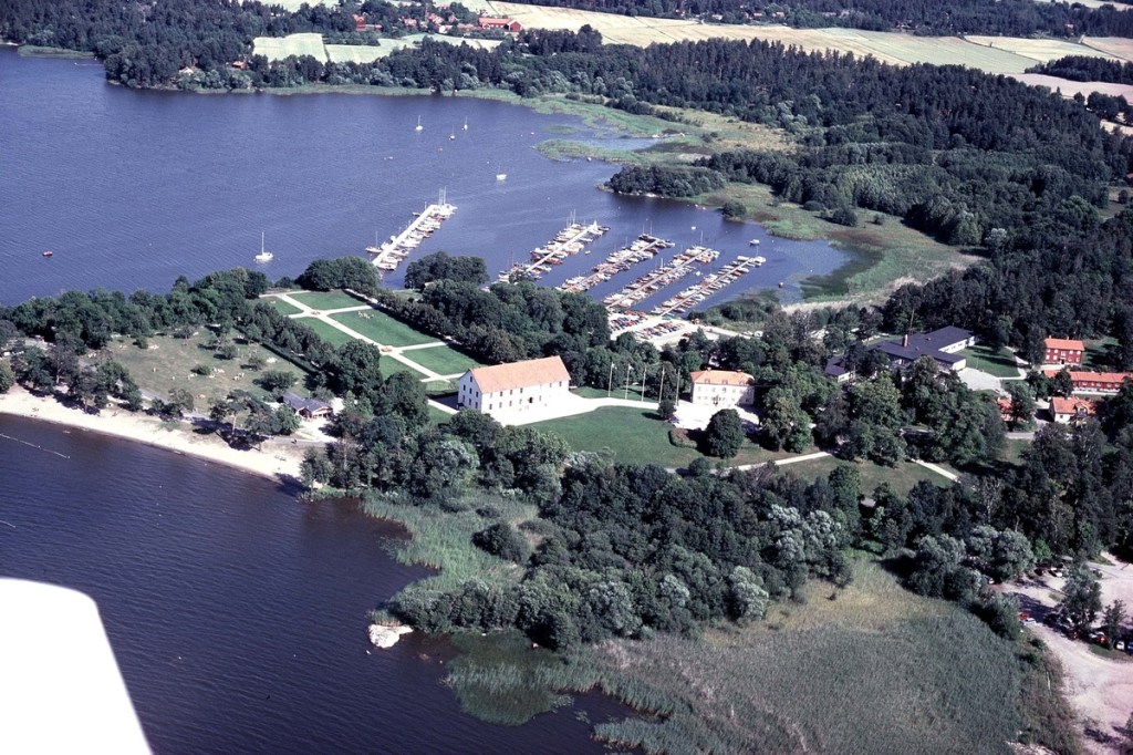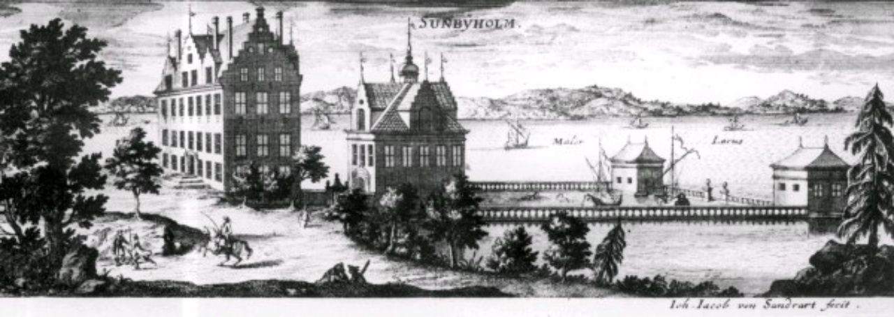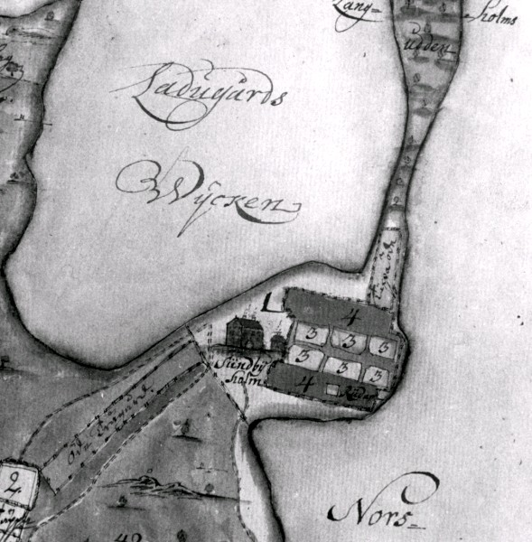 ”Lantmätare Anders Mörns karta över Sundbyholms slott från 1723, visar hur de bägge byggnaderna, Gamla och Nya huset, ligger vid basen av den sandiga halvön ut i Målaren. Nr 2 på kartan visar ladugården. Nr 3 stora trädgården anlagd till kryddsängar och kålland. Nr 4 betecknar fruktträdgården”