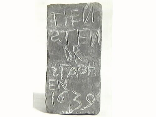 ”För att manifestera tidpunkten för byggets igångsättande gör en skrivkunnig person – kanske byggherrens betrodde murmästare Hans Drissel eller hans tegelslagare – en inskription på en ännu fuktig tegelsten. Den stenen kom sedan att med sin text dold sitta inmurad i hjässan av ett källarvalv för att vid restaureringen drygt år 300 år senare av en händelse hittas och sålunda dokumentera valvets ålder”. Den har nu på nytt murats in i källaren med inskriften synlig.